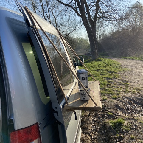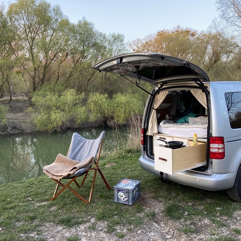 Fest verschraubte Campingbox mit Klappbettfunktion, plus ein zweiter Corpus mit Schublade. Lochplatten in den hinteren Fensterscheiben, selbst gebaute Seitenteile, die mit dem Plastik-Originalteilen getauscht wurden. Dachhimmel ist mit Dschungelmotiv verziert worden. Das kleine Highlight ist die Kühlschublade, die ich in die Campingbox verbaut habe.