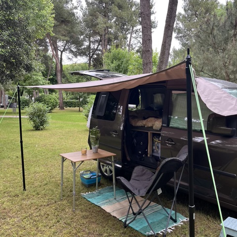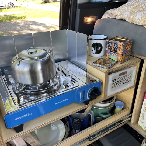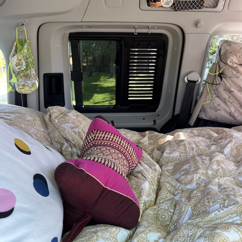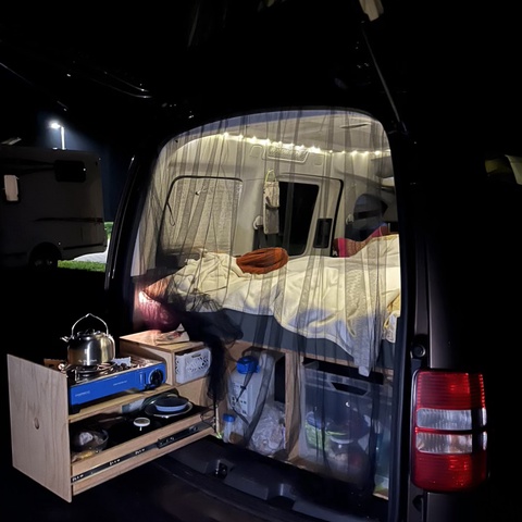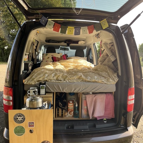 Inspiriert von der Caddy Community habe ich mich für einen Nachbau einer der gängigen, jederzeit wieder herausnehmbaren Boxen entschieden, da ich den Caddy auch für andere Transportzwecke brauche. In eine der drei Fächer am Heck installierten wir eine ausziehbare Miniküche, mein absolutes Lieblingsteil. In der mittleren Box befindet sich mein Wasserkanister mit Hahn und mein Tisch, rechts eine große Eurobox für alles, was man so braucht. Das Bett wird klassischerweise ausgeklappt und mit der stapelbaren Matratze ausgelegt - diese ist eine Spezialanfertigung mit Viskoschaum vom örtlichen Polsterer. Meine Möbel, Stützen für das Sonnenpanel und weitere Euroboxen passen unters ausgeklappte Bett. Als Kühlung habe ich eine thermoelektrische Kühlbox, die ich immer während der Fahrt anschalte und an Campingplätzen mit Strom versorge, manchmal nehme ich auch einfach nur Kühlpads mit. Fenstertaschen habe ich mir selbst genäht - ich befestige sie mit Saugnäpfen, was so lala funktioniert. Rentiert hat sich der Kauf eines Lüftungsgitters fürs Fenster, und besonders freue ich mich über mein DIY-Sonnenpanel. Als Stromquelle habe ich eine Powerstation mit Solarpanel dabei.