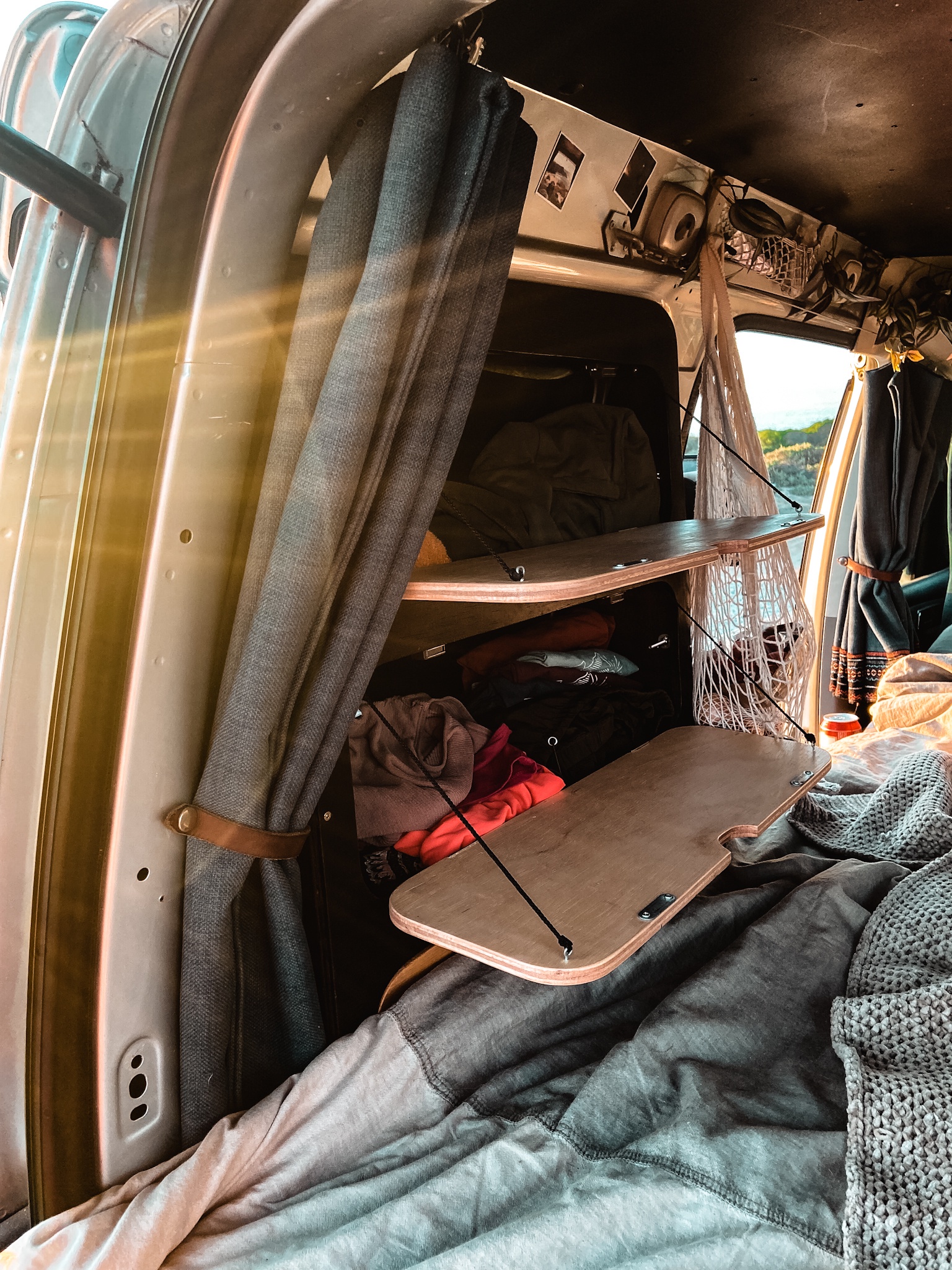 Um auch den Platz vor den Fenstern im Minicamper zu nutzen, gibt es verschiedenste Ansätze, von denen ihr einige in unserer Community anschauen könnt. Nadine hat zum Beispiel in aufwändiger Detailarbeit Schränke vor die Fenster gebaut, wodurch sie sehr viel Platz gewonnen hat, den sie als Kleiderschrank nutzt. Anna hingegen hat an einem Fenster eine Lochplatte befestigt, an der sie dank dem umfassenden Zubehör eines schwedischen Möbelhauses jede Menge Kleinkram unterbringen kann und auf der anderen Seite hat sie, wie auch Vanessa & David, die praktische Fenstertasche von Layzee Camping angebracht: Die Fenstertaschen nutzen den Bereich vor den hinteren Seitenfenstern perfekt aus und können ohne Bohren oder Kleben befestigt werden. Dazu wird einfach die zugehörige Verdunklungs- und Trägerplatte zwischen Verkleidung und Fenster geschoben. Deshalb sind die Fenstertaschen nur für Caddys, die über eine komplette Verkleidung hinten verfügen, geeignet. Es ist wirklich sehr praktisch, dass man die Taschen einfach in der Wohnung packen kann und nicht alles in Kisten oder anderen Taschen zum Auto schleppen muss. Die Taschen gibt es für den kurzen Caddy und den Caddy Maxi in hellgrau und anthrazit.
