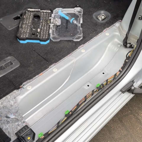 Ich hatte mich entschieden das Setup hinter meinem Fahrersitz in den Fußraum zu bauen. Demnach verläuft die gesamte Verkabelung an der linken Fahrzeugseite. Um alle Kabel ordentlich zu verlegen, haben wir zunächst die Verkleidung entfernt. Hierzu haben wir im Kofferraum die linke Seitenverkleidung entnommen und die Verkleidung im Fußbereich der Fahrertür sowie der linken Schiebetür entfernt.