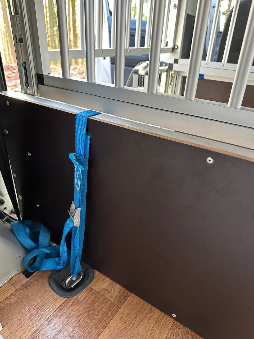 Damit die Hunde in der Box auch sicher sind ist es natürlich wichtig die Hundebox auch sicher zu befestigen. Mit drei Spanngurten sind sie an den Sitzhalterung und an den Zurrpunkten im Boden befestigt. Somit steht sie sicher und kann nicht verrutschen.