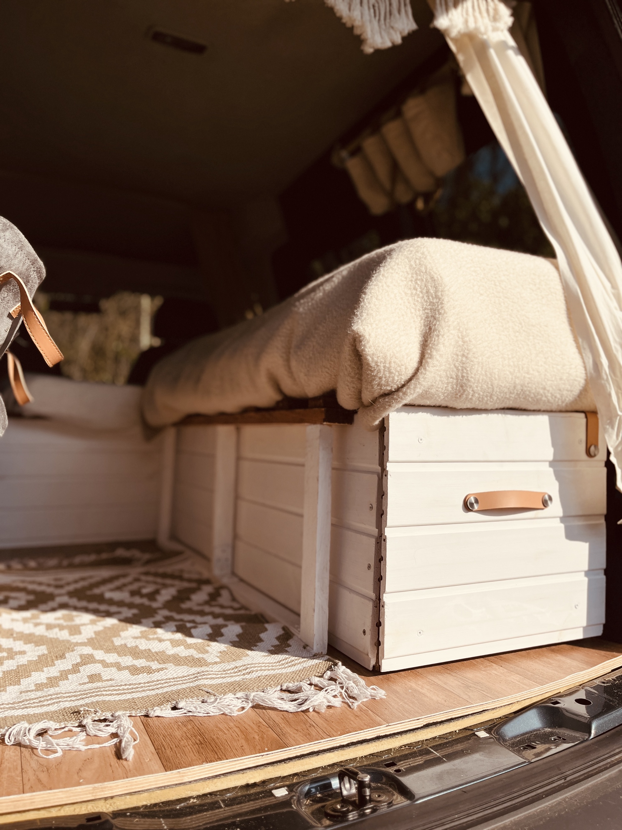 Ich habe mich bewusst für ein Ausziehbett entschieden, damit ich bei schlechtem Wetter nicht immer im Auto liegen muss, sondern auch mal drinnen sitzen kann. Unter dem Bett befindet sich ein Auszug in dem meine Küche und alle notwendigen Utensilien verstaut sind. Mein Schrank auf der anderen Seite ist derzeit noch nicht ganz fertig, dort werde ich im unteren Bereich noch Schiebetüren eingebaut.