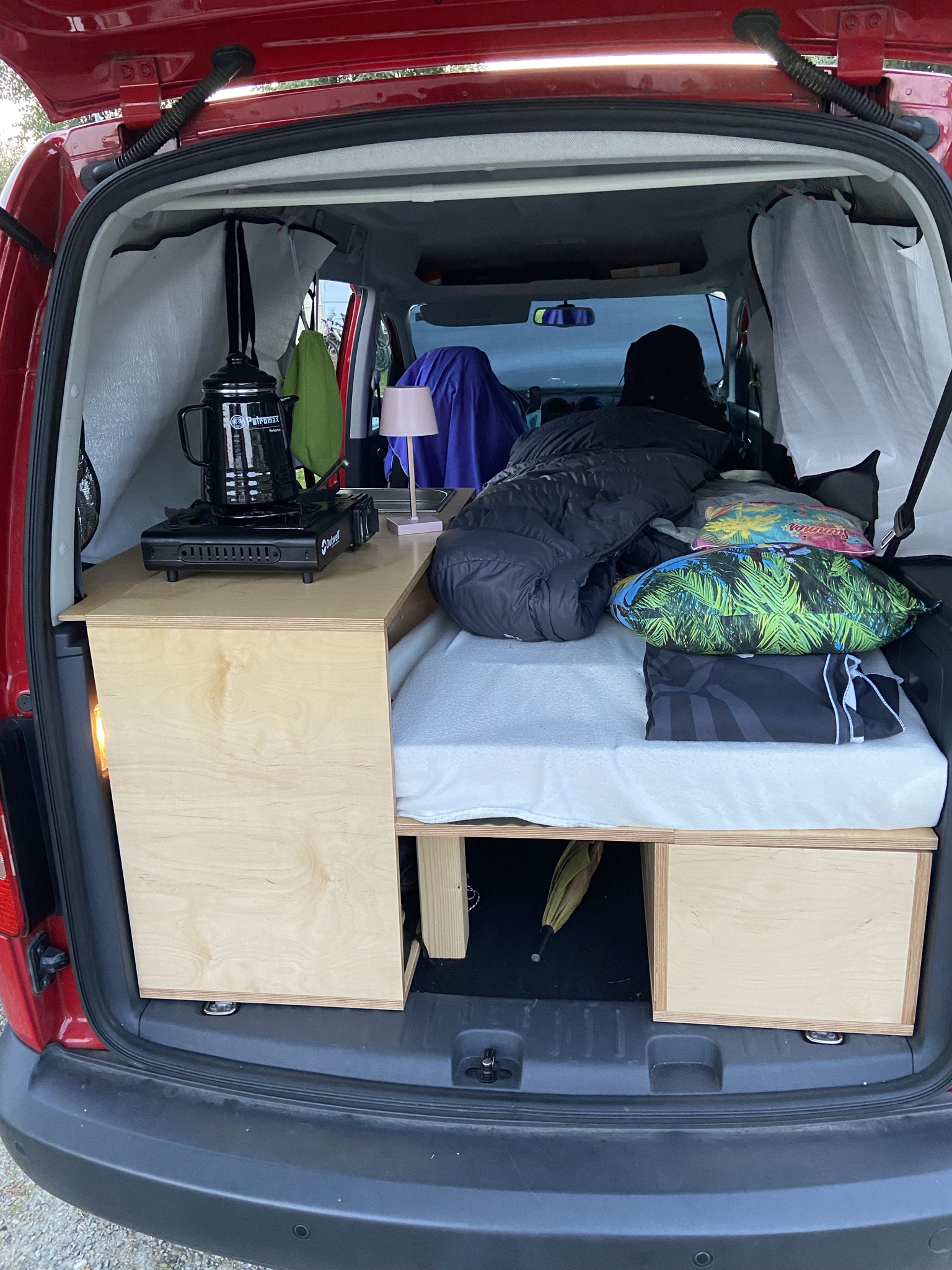 Mein Ausbau besteht aus drei Elementen. Links befindet sich eine Art Sideboard mit Spüle/ Frischwasser+Abwasserkanistern/ 12V Anschlüsse+ für Landstrom, 2 Steckdosen 230W. Rechts befindet sich eine längliche Kiste unter der einiges verstaut werden kann. Auf Höhe der ausgebauten Rücksitze befindet sich eine dritte Kiste mit der Zweitbatterie und einem Umwandler/ Steckdosen und 12V Anschlüssen. Durch zwei Holzplatten (die größere ist gleichzeitig die Vorderfront des Sideboards)die zwischen die Boxen gelegt wird, habe ich eine Schlaffläche von 60x200m. Dazu habe ich ein Bus-Heckzelt von Obelink Maritime VK, welches ich mit zusätzlichen Saugnäpfen am Dach befestigen kann oder auch freistehend aufbauen kann. Für WE Trips habe ich mir ein Heckzelt von Brunner gekauft, das reicht für ein wenig zusätzlichen Raum. Bin aktuell dabei, den Ausbau neu zu gestalten…. Bett mit Lattenrost.